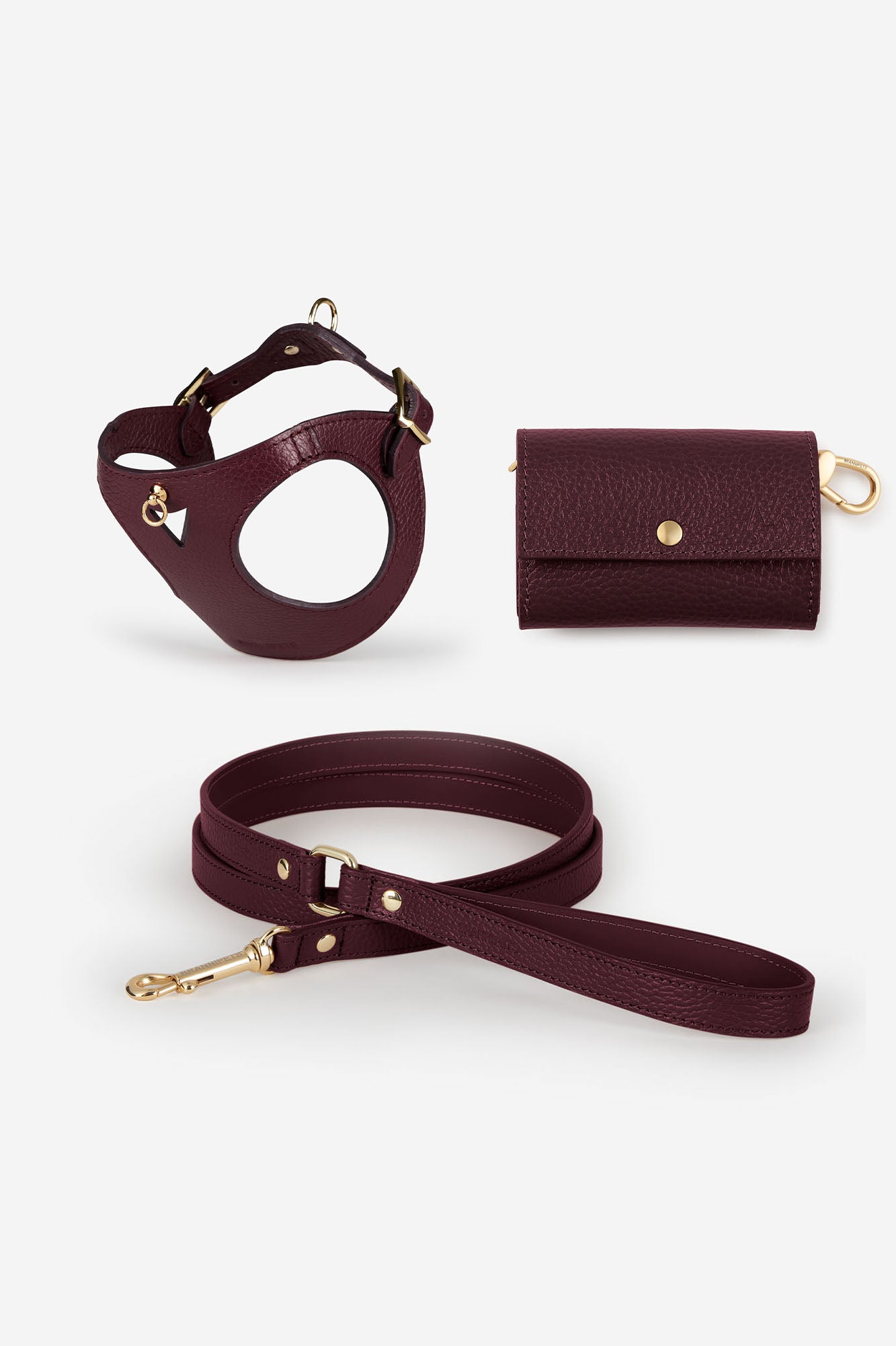 The burgundy Juno harness set is perfect for walks with your dog. It includes a leather harness, a lead to choose from Toy or Standard, and a matching poop bag holder. All made from high-quality leather, designed to ensure your pet's comfort and safety on every outing.